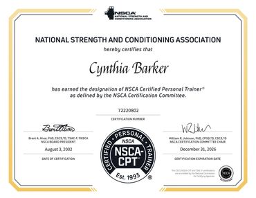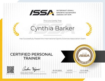 Cynthia is a Certified Personal Fitness Trainer with National Strength and Conditioning Association (NSCA) & International Sports Sciences Association (ISSA).